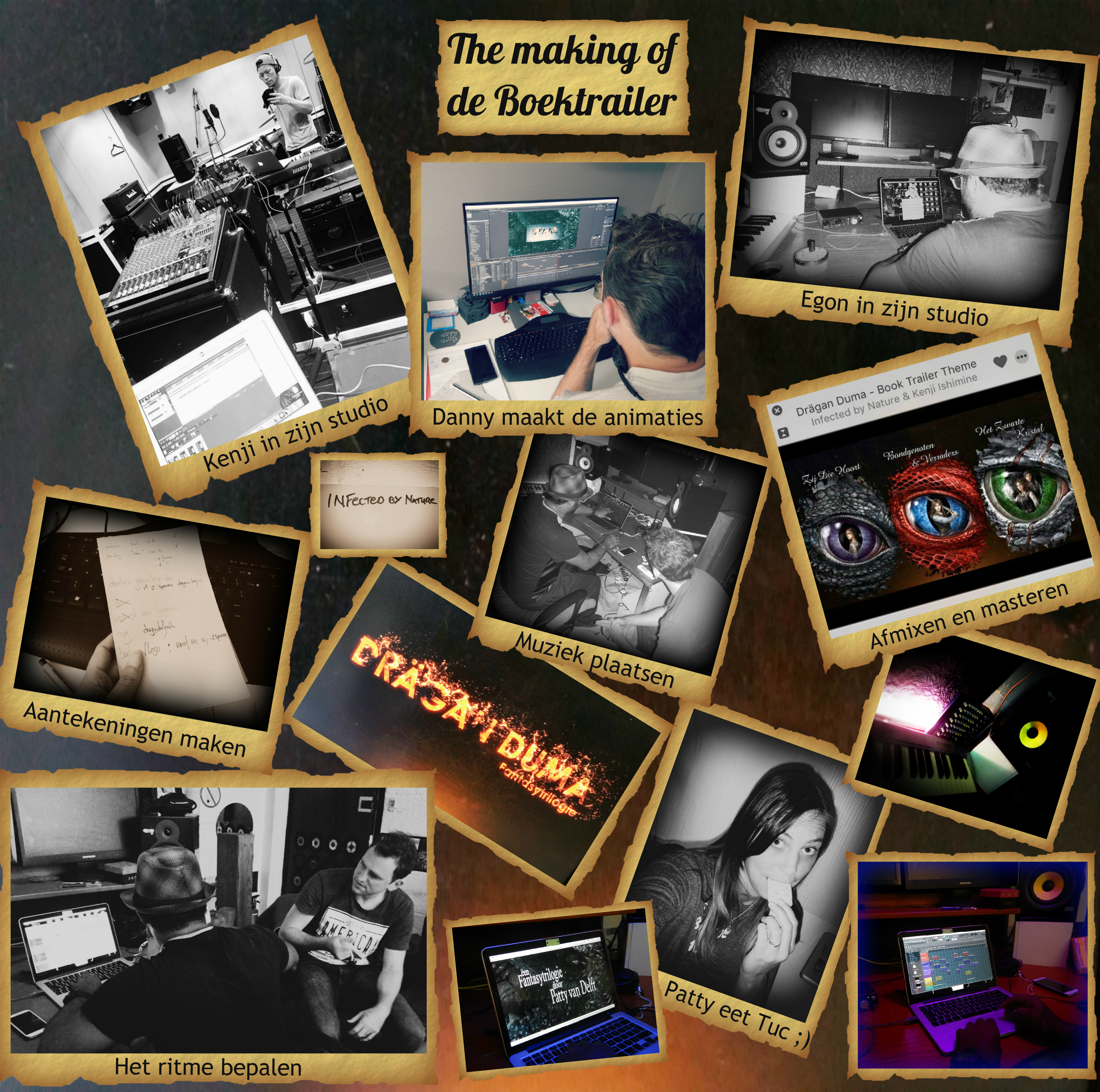 Om een lang verhaal kort te maken: na veel aantekeningen, avonden achter de computer, nachten in de studio (in Nederland en Japan!) en een paar handen vol Tuc’jes later is het dan bijna zover, de Drägan Duma boektrailer komt eraan! Dus houd de website en Facebookpagina in de gaten 🙂 Hieronder vind je nog een fotocollage van de Making of.