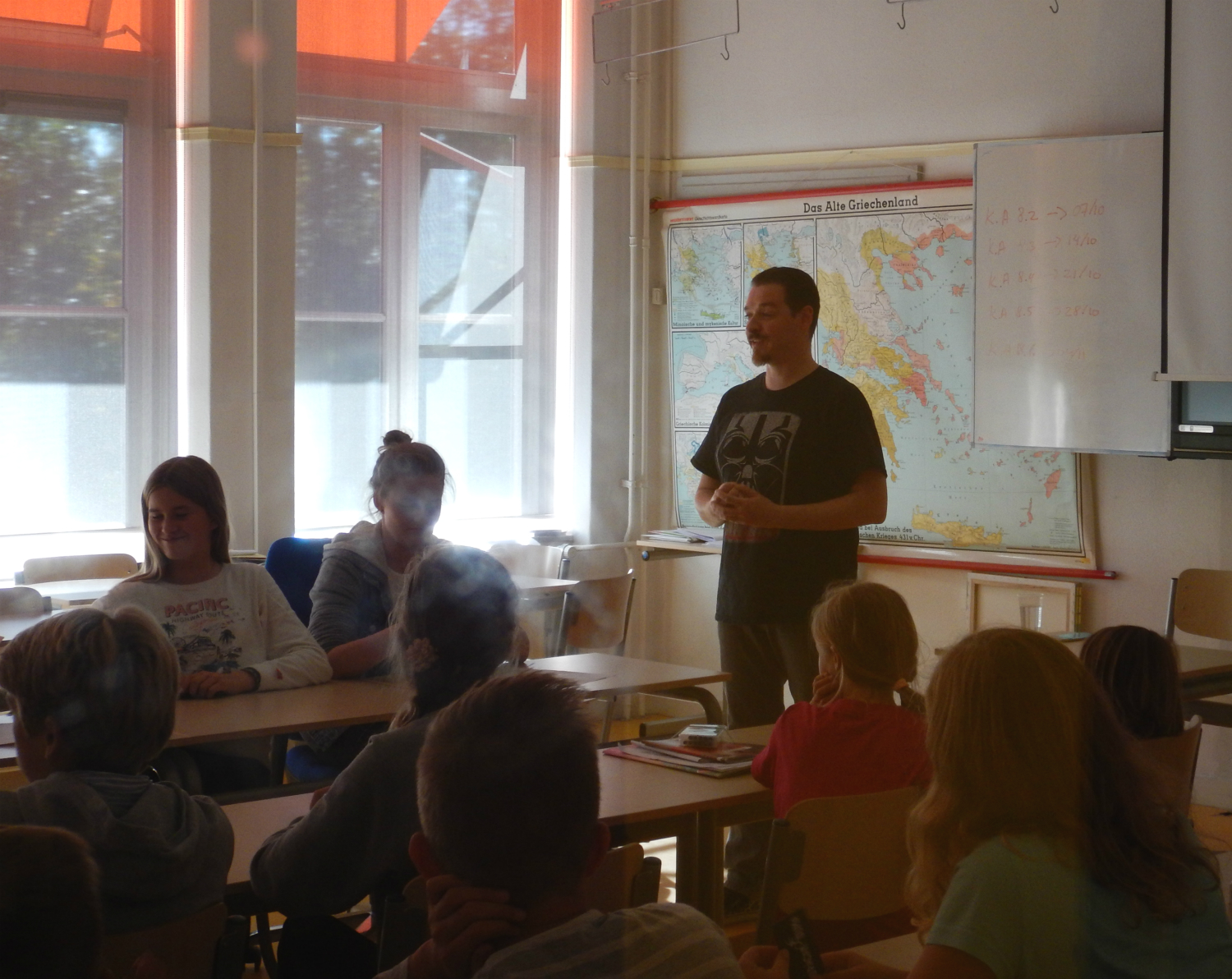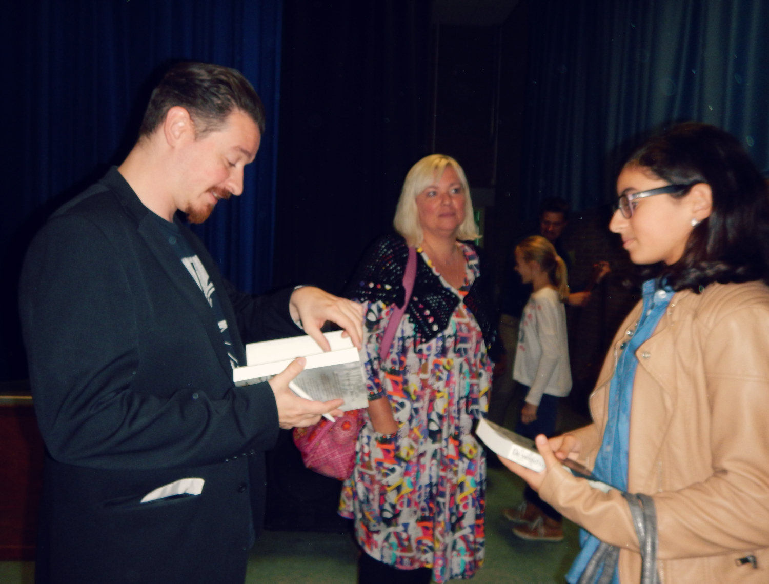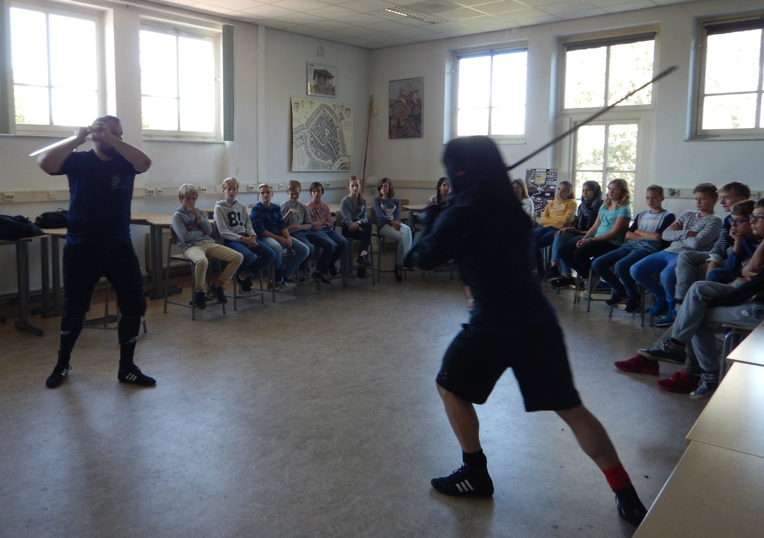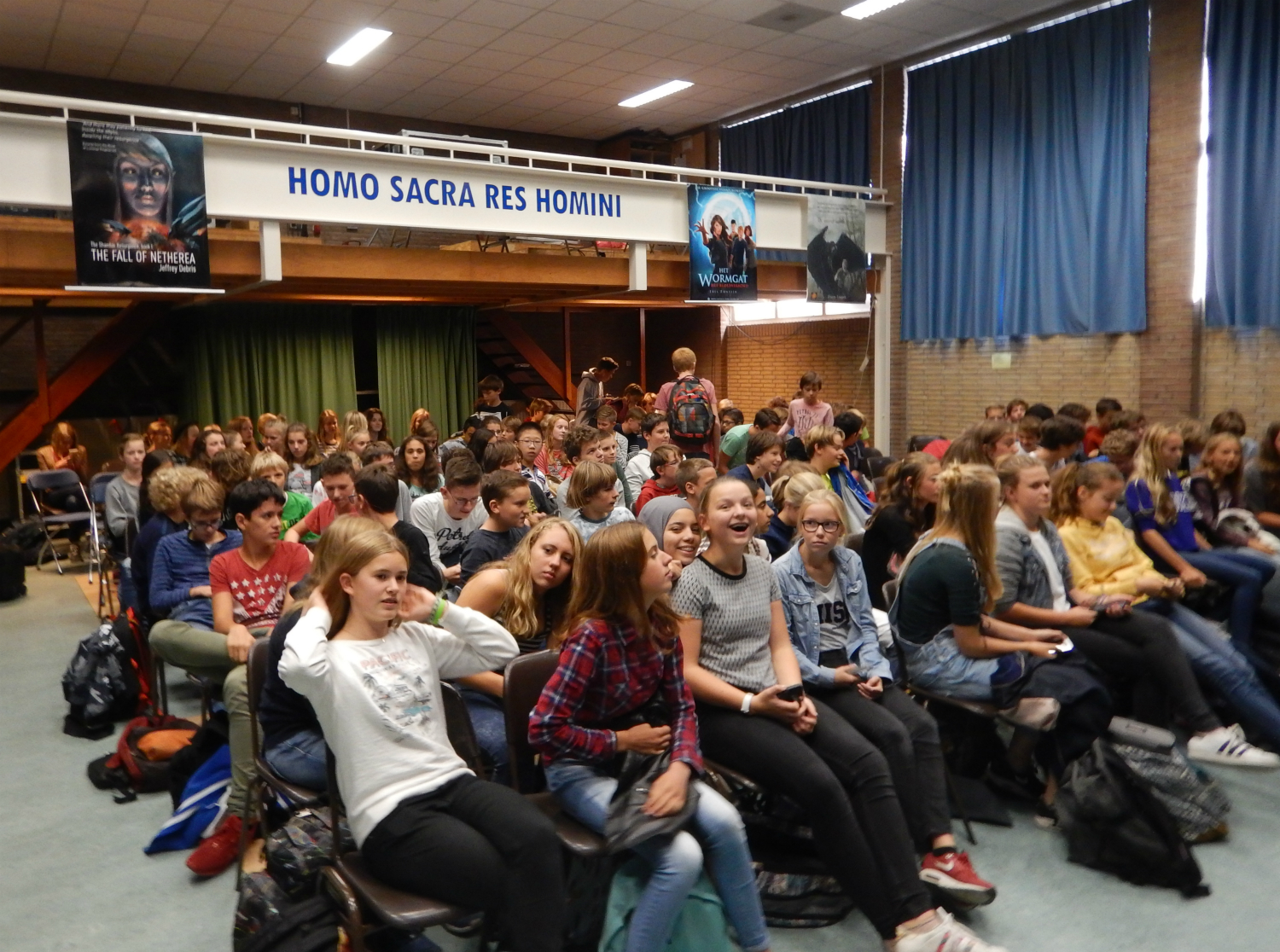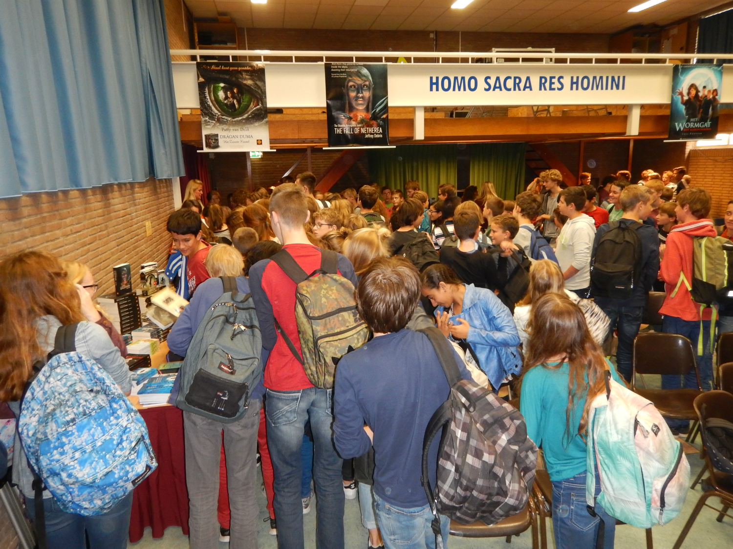 Het was een ontzettend leuke middag met de leerlingen. Wij mochten over onze boeken en het schrijversvak vertellen en zij kregen volop de gelegenheid om vragen op ons af te vuren. 20 minuten per lokaal en tussendoor een workshop middeleeuws zwaardvechten door Michel Rensen.