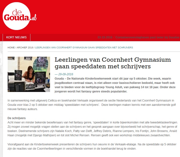 In samenwerking met uitgeverij Celtica en boekhandel Verkaaik organiseerde de sectie Nederlands van het Coornhert Gymnasium in Gouda voor klas 2 op 5 oktober een middag ‘speeddaten met schrijvers’.