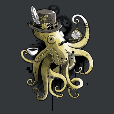 Dingen die je vaak terug ziet komen binnen het genre zijn bijvoorbeeld klokken, raderen en octopussen. Maar waarom is nou juist de octopus een soort mascotte binnen Steampunk? Natuurlijk omdat het boek 20.000 mijlen onder zee van Jules Verne van grote invloed is geweest op dit genre en er in dat verhaal zeer grote octopussen voorkomen. Maar ook bijvoorbeeld omdat een octopus een zeer inventief dier is en daar draait het in het genre natuurlijk ook om. En in de 19e eeuw was de octopus een symbool van de industriële revolutie en spoorwegen. Een perfecte mascotte dus!