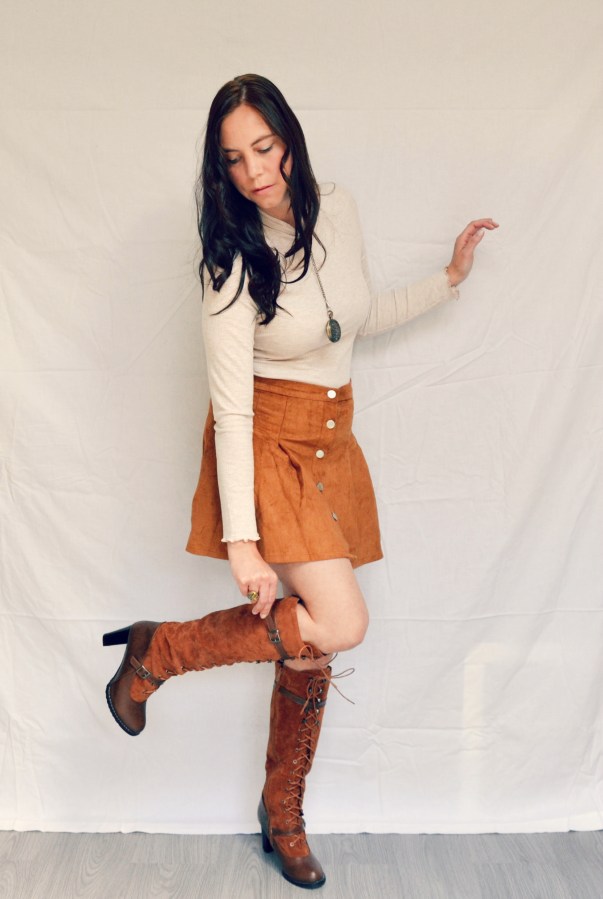 Een rok combineer je met hoge laarzen en bijvoorbeeld een zakhorloge die je als ketting draagt.
