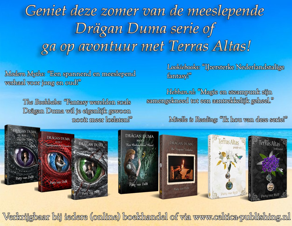 Dit bericht werd geplaatst in Drägan Duma, patty van delft, Terras Altas en getagd met boek, boeken, Celtica Publishing, draken, Drägan Duma, fantasy, lezen, magie, Patty van Delft, steampunk, vakantie, vakantieboek, vakantietip, young adult, zomer. Maak de permalink favoriet.