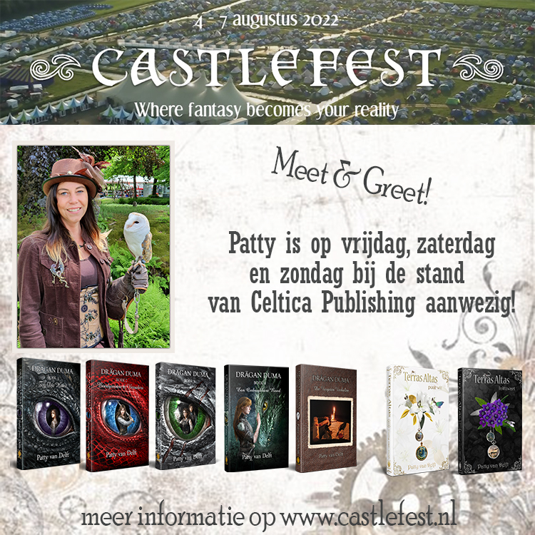 Patty is op vrijdag, zaterdag en zondag aanwezig bij de stand van Celtica Publishing. Kom gezellig langs voor een praatje, foto of natuurlijk een tof boek!