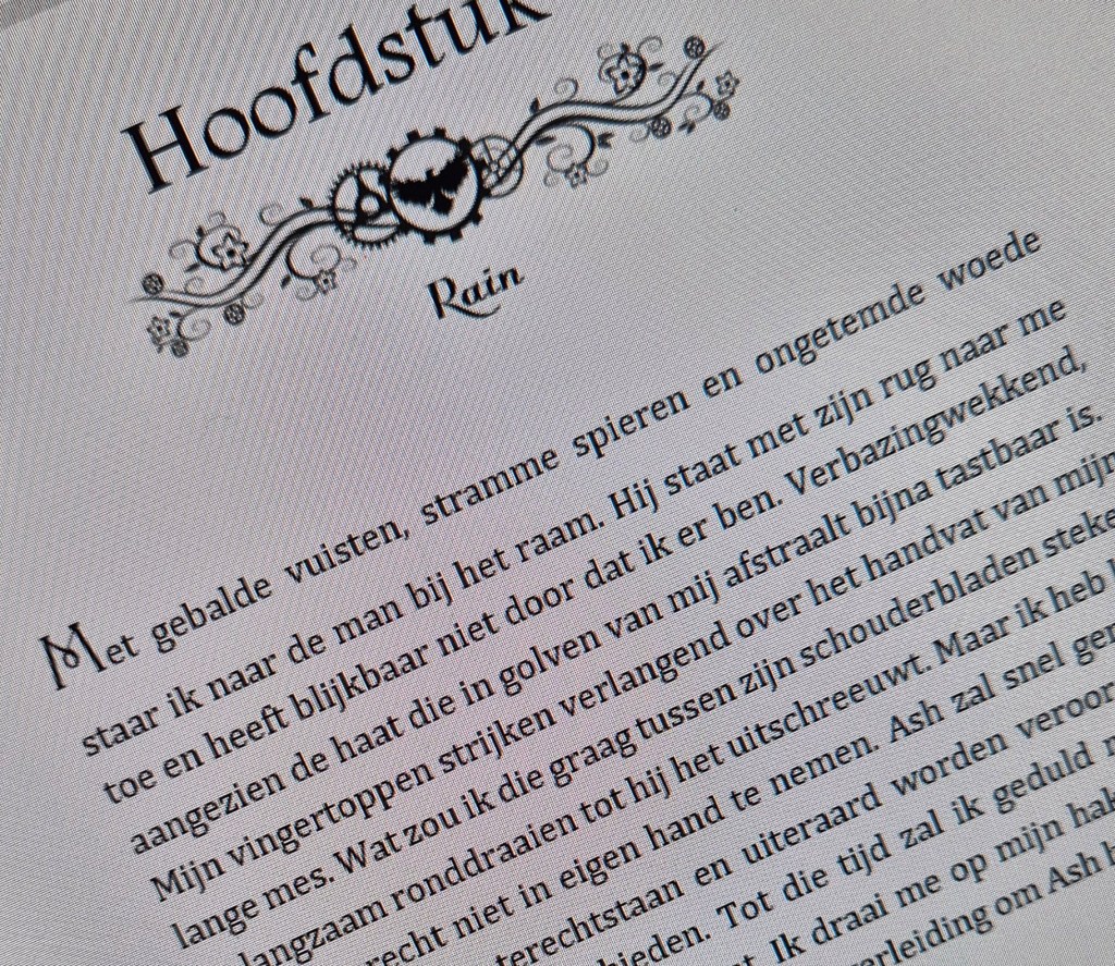 Natuurlijk ben ik pas net echt begonnen met het schrijven van dit deel, dus wat je hierboven ziet is de echt ruwe, ruwe versie. Wel kun je al zien wat ik als ornamentje voor Rains hoofdstukken heb verzonnen. Dat is iets dat eigenlijk niet meer verandert wanneer het eenmaal gemaakt is.