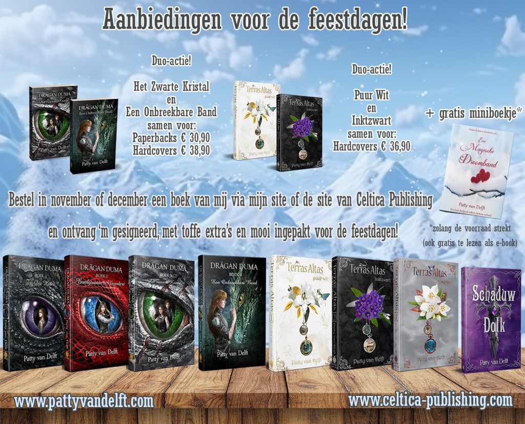 Celtica Publishing heeft nu Duo-acties voor mijn boeken. 🙂 Zo kun je Het Zwarte Kristal en Een Onbreekbare Band of Puur Wit en Inktzwart nu samen met 5 euro korting kopen!
